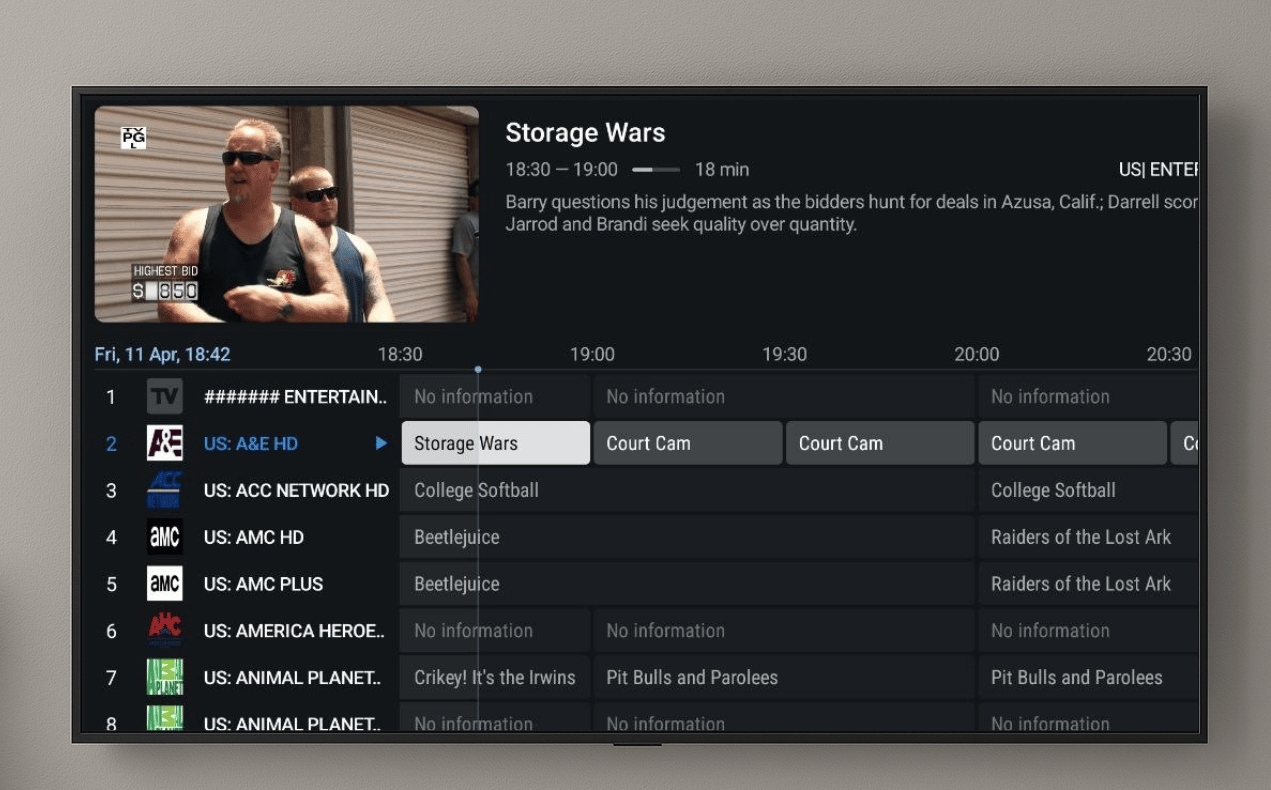 Optimized for FireTV and Android TV. Full grid-style EPG with advanced features. Perfect for big screen viewing with comprehensive channel guide.